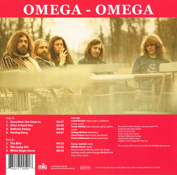 Лейбл MIG, Формат 1LP, Каталожный номер MIG02591 A1 Everytime She Steps In A2 After A Hard Year A3 Delicate Sweep A4 Parting Song B1 The Bird B2 The Lying Girl B3 White Magic Stone Backing Vocals - Simon Mihály Bass, Acoustic Guitar, Piano, Vocals - Tamás Mihály Drums, Percussion - Ferenc Debreceni Lead Guitar - György Molnár Lead Vocals, Percussion - János Kóbor Organ, Piano, Mellotron, Synthesizer, Vocals - László Benkő Producer - Peter Hauke Written By - Omega